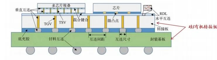硅中介层有TSV的集成是最常见的一种2.5D集成技术,芯片通常通过MicroBump和中介层相连接,作为中介层的硅基板采用Bump和基板相连,硅基板表面通过RDL布线,TSV作为硅基板上下表面电气连接的通道。