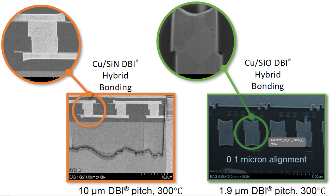 10 µm 间距混合键合(左)和 1.9 µm 间距混合键合(右)