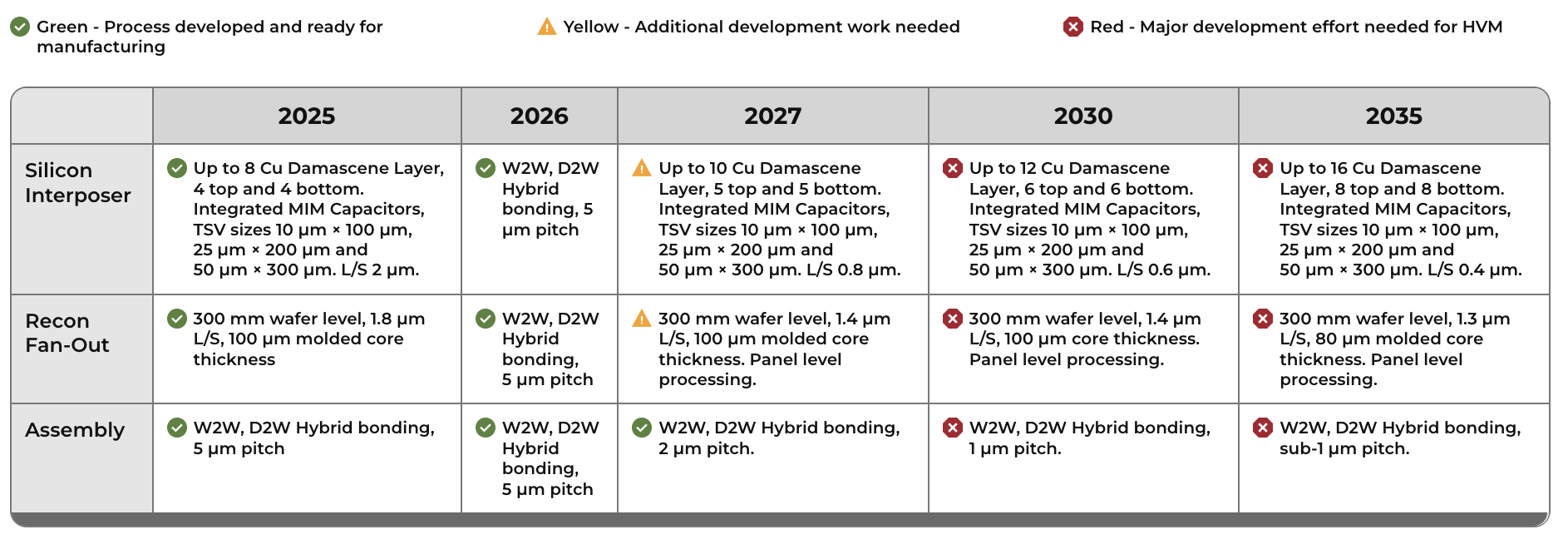 采用先进键合技术实现的混合互连,芯片到晶圆 (C2W) 间距小于 3 µm(互连密度大于 10 5 /mm2),要求:3σ 放置精度小于键合间距的 10%;空隙不得大于键合间距的 0.5%,总空隙密度不超过键合间距的 2.5%;无颗粒和无缺陷(尺寸大于 50 nm)的组装工艺和流程;以及具有无空隙填充(void-free fill)、低应力和弯曲以及高热导率的芯片间间隙填充( inter-die gap fill)材料。